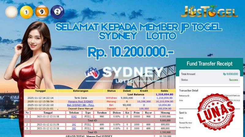 SELAMAT KEPADA MEMBER JP TOGEL SYDNEY LOTTO Rp. 10.200.000.- LUNAS