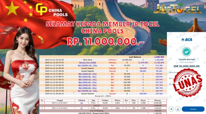 SELAMAT KEPADA MEMBER JP TOGEL CHINA POOLS TOTAL Rp. 11.000.000.- LUNAS