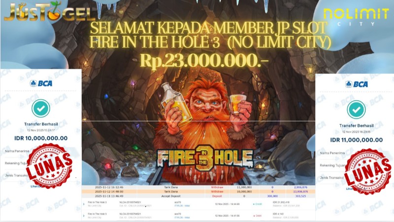 Selamat kepada User ID : AC***0 Telah berhasil mendapatkan kemenangan besar pada Permainan JP SLOT FIRE IN THE HOLE 3 ( NO LIMIT CITY) Dengan kemenangan Sebesar Rp 23.000.000,- Setelah mengisi formulir withdraw dengan kurung waktu hanya 5-10 menit pihak JUSTOGEL sudah melakukan transfer kepada pemilik User ID dan dana sudah dapat di cairkan oleh pemenang. Bukti pembayaran yang kami berikan merupakan bukti pembayaran yang SAH / VALID yang langung di dapatkan melaui tanda transfer transaksi dari Bank yang di tuju.
