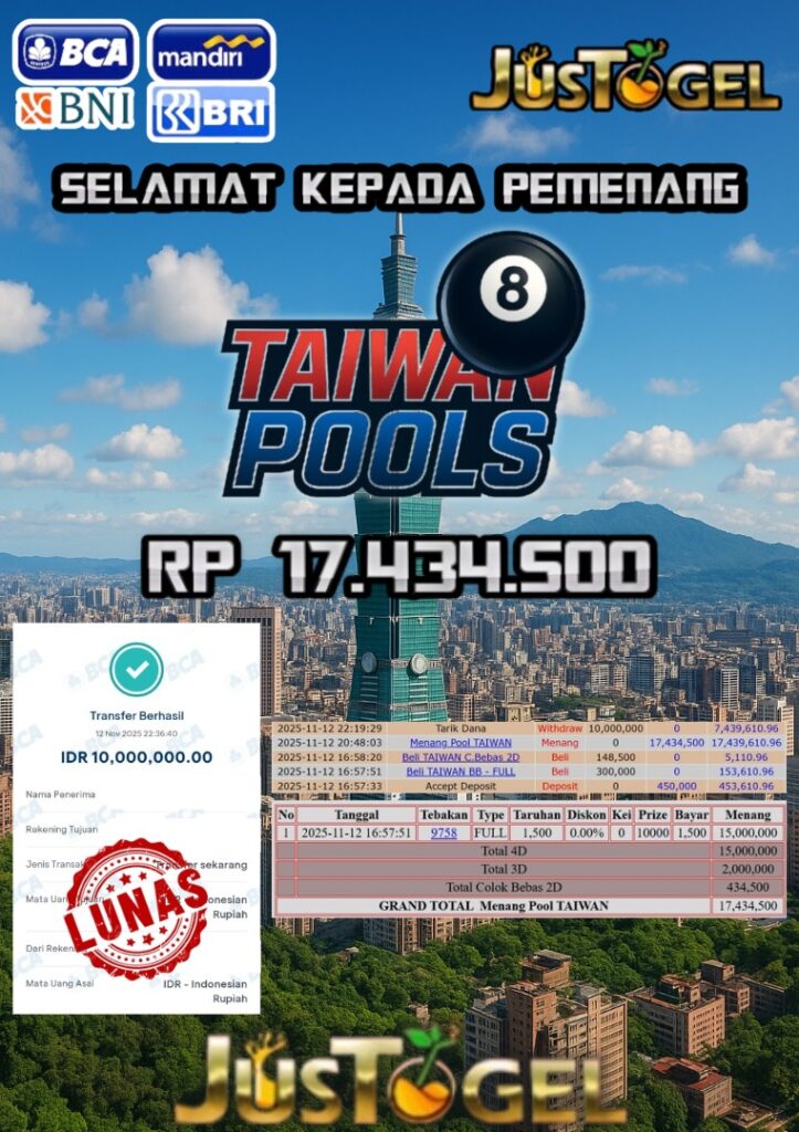 SELAMAT KEPADA MEMBER JP TOGEL TAIWAN POOLS TOTAL Rp. 17.434.500.- LUNAS